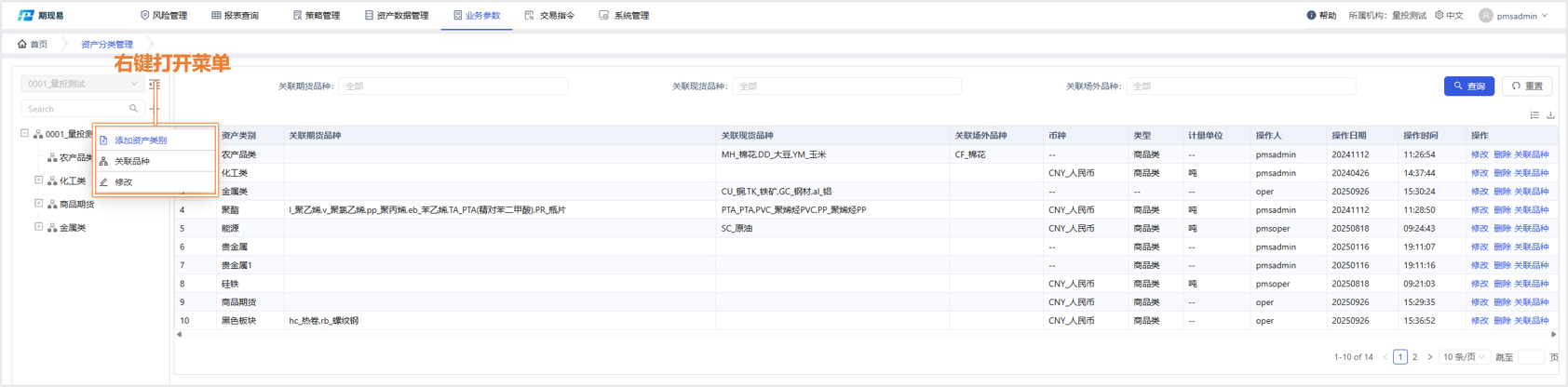 选中某资产类别,右键打开菜单,点击【关联品种】,可将品种关联到该资产类别上。