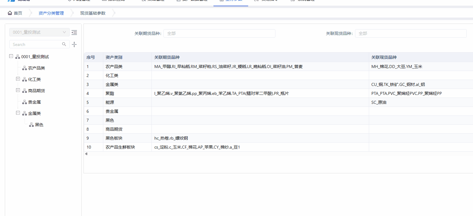 用于对参与期现业务的品种进行分类管理,系统可以按用户定义的资产类别进行期现核算,并按对应维度呈现期现报表。
