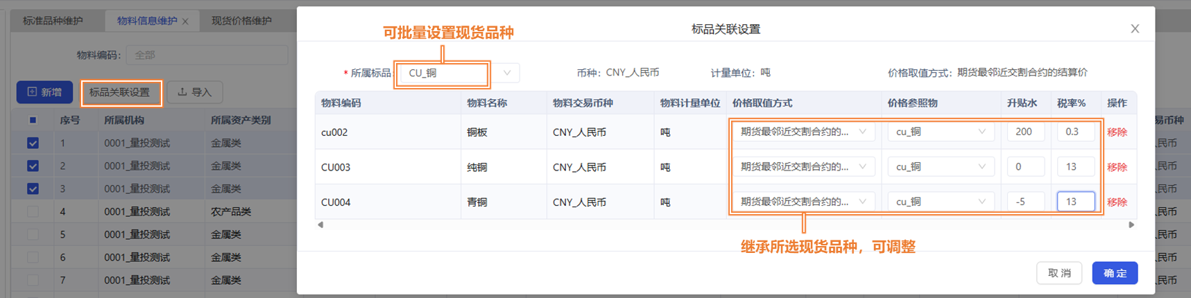 1)物料导入后,可通过[品种关联设置]对所选物料关联现货品种,关联品种后默认继承品种上的属性,可调整。 2)物料关联品种后,也可通过品种关联设置批量调整关联品种及相关属性值。