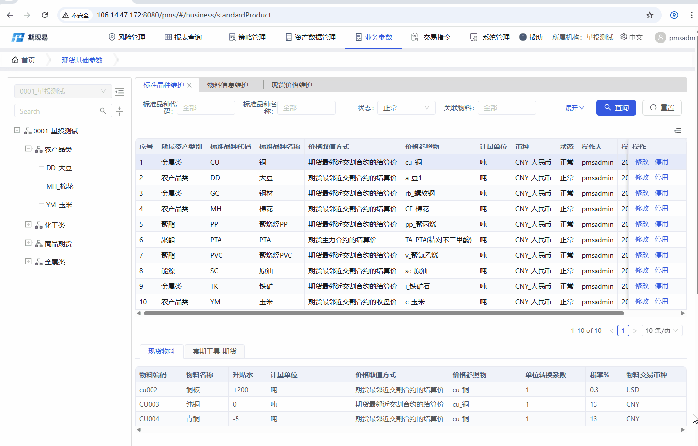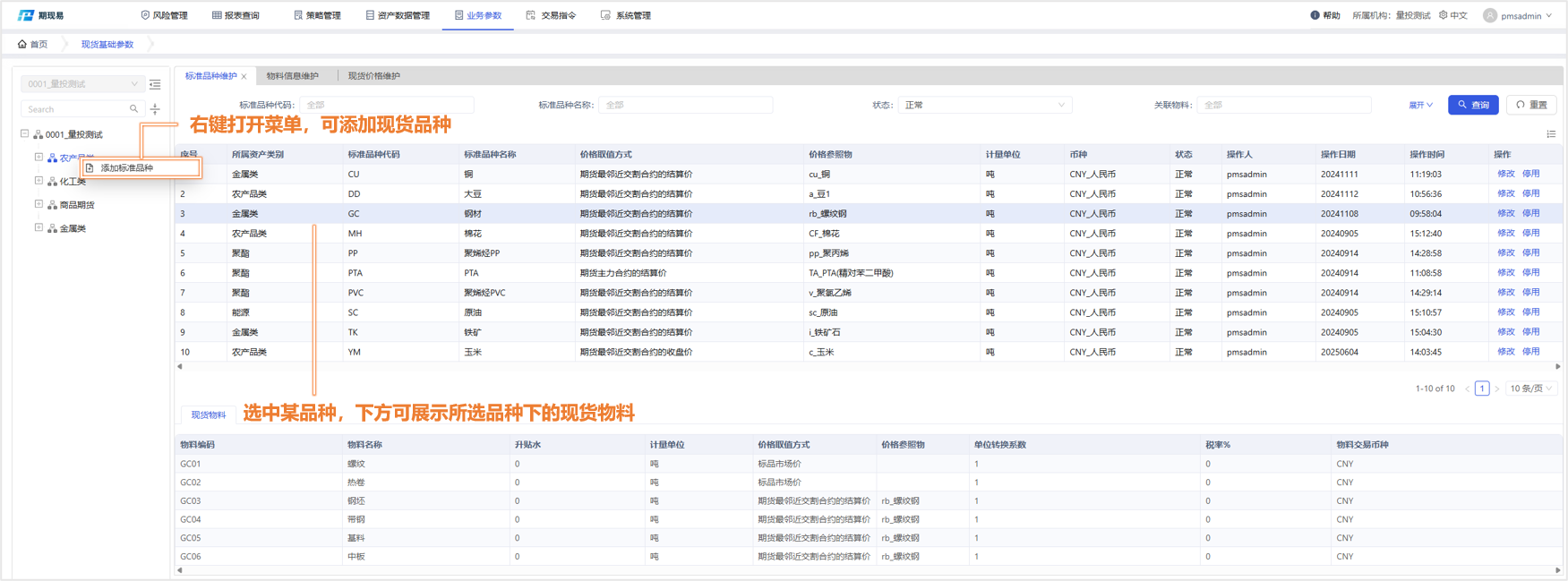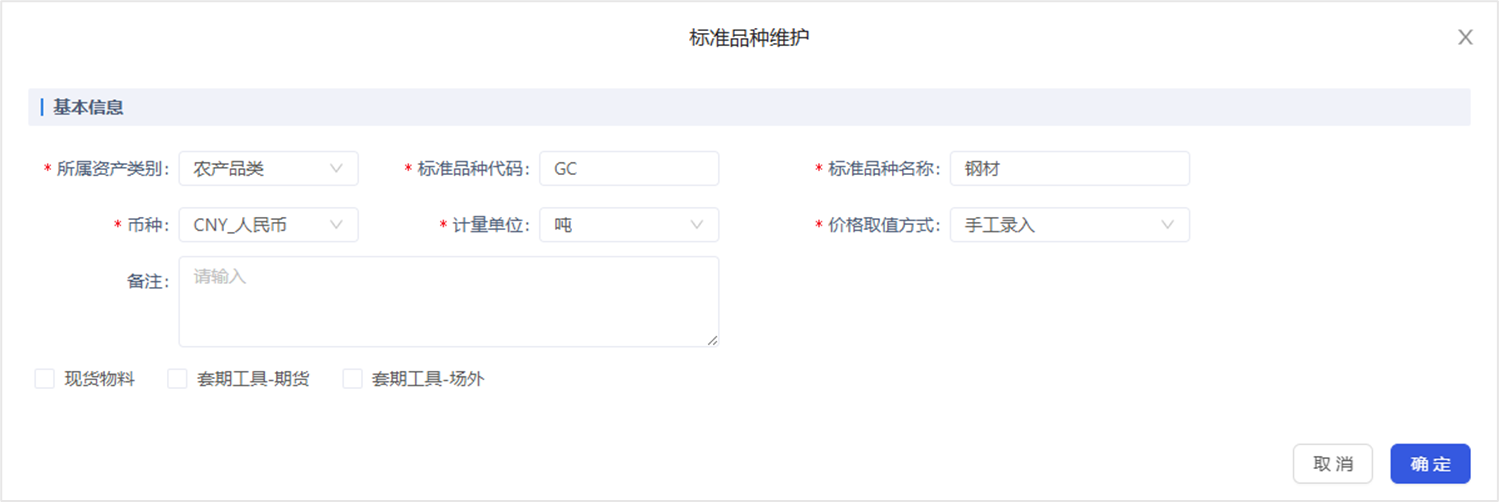 用于设置现货业务用到的基础参数,包括现货品种、现货物料(子品种)、现货每日行情价格。