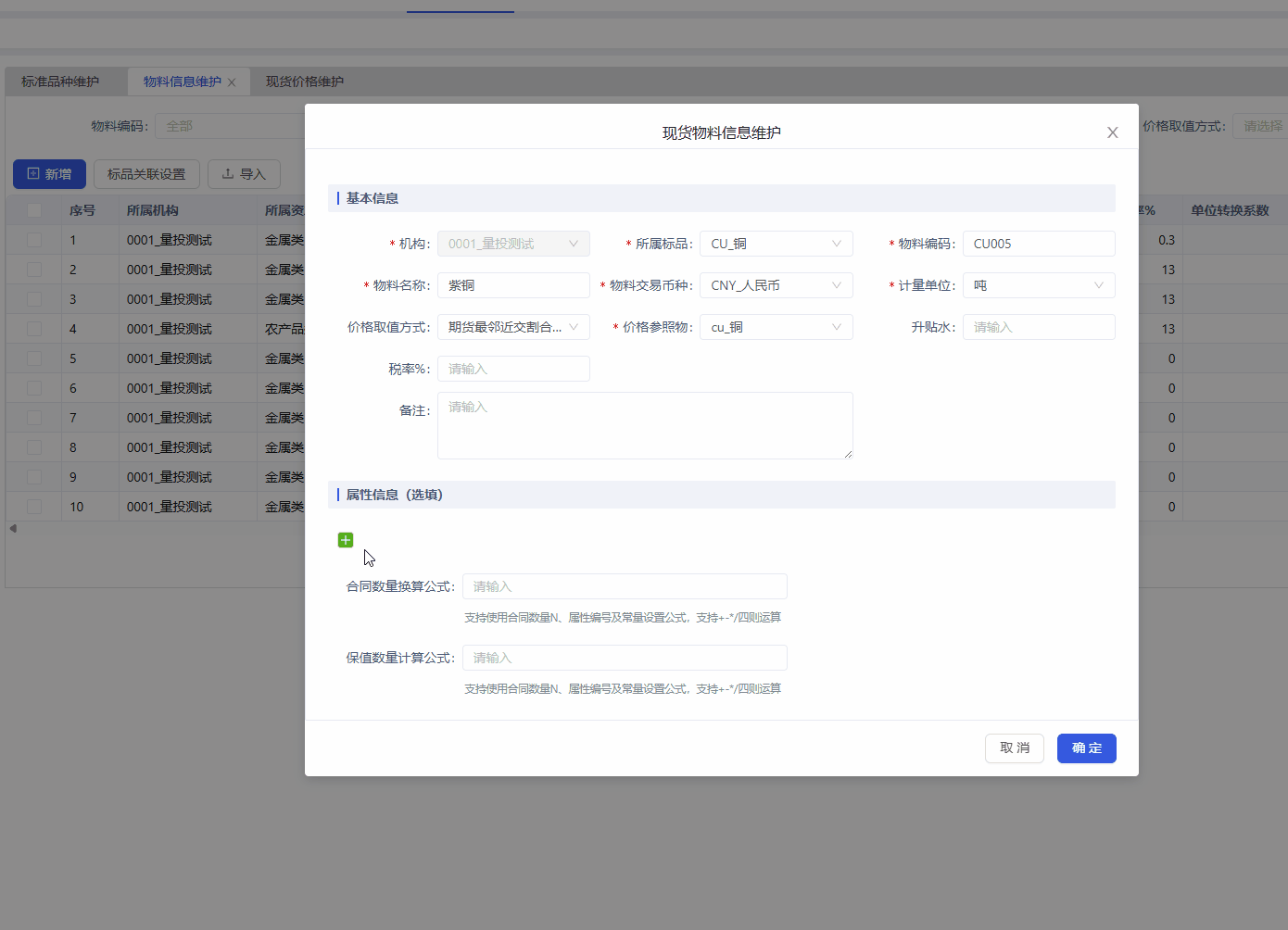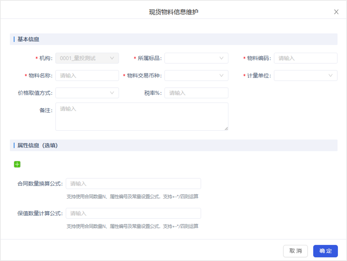 可自行添加现货物料的属性,非必填;支持按合同数量、自定义属性设置合同数量换算公式、保值数量计算公式,系统根据物料上设置的计算公式对该物料的合同计算换算后的合同数量及保值数量。