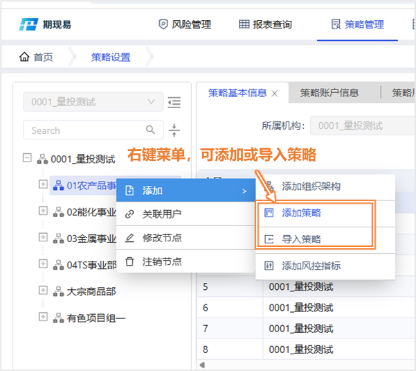 选中根节点或某组织架构节点,右键打开菜单,可在所选节点下创建策略,可通过添加或者导入两种方式创建。