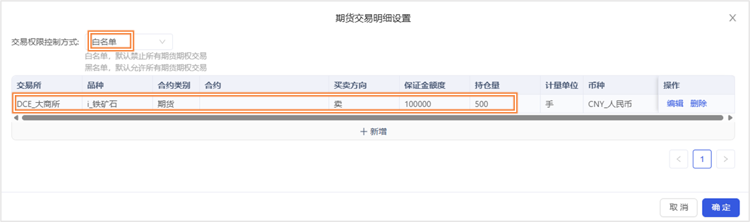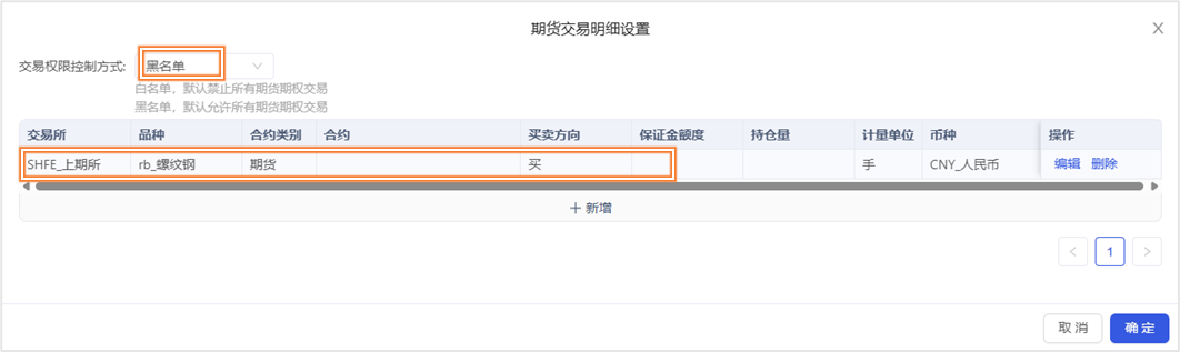 【期货交易权限设置】 可对策略交易的品种、方向、持仓量、保证金额度进行控制,控制方式为事前控制。 支持白名单、黑名单两种方式: