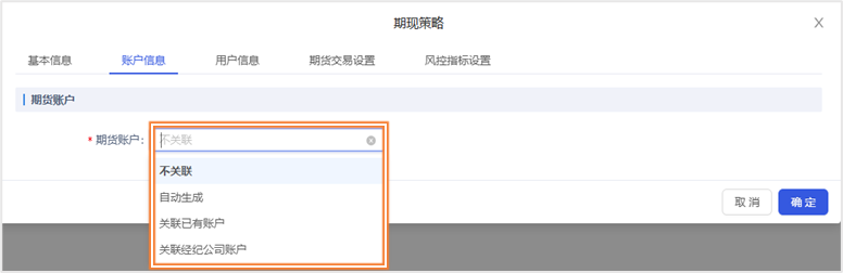 【账户信息】 用于设置策略的期货下单账户,系统根据关联的下单账户获取策略期货交易数据。