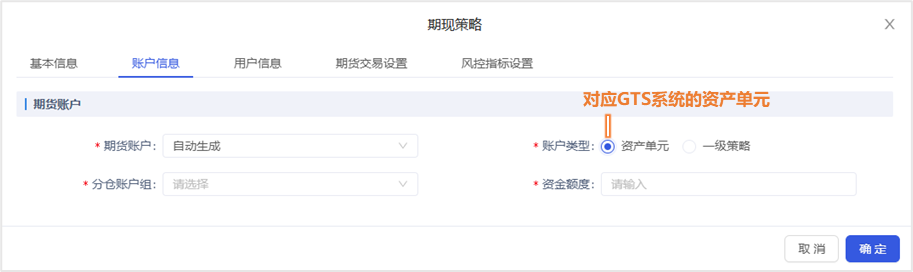 关联资产单元:GTS系统资产单元,在所选资产单元下为策略创建下单账号,即该策略通过所选资产单元进行期货交易;可通过[资产单元设置](../../Business parameters/Accountsettings/Assetunitsettings)创建资产单元。