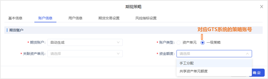 该策略在GTS期货系统已存在下单账号,可将期货下单账号关联至策略,可选择关联“资产单元”或者“ 一级策略”,仅可关联一个账号。