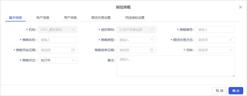 策略开始日期:进入开始日期(含)后允许期货交易。 策略结束日期:进入结束日期(含)后禁止期货开仓,只能平仓。 币种:系统暂未使用该币种。 状态:默认为“执行中”,可以选择“预警中”、“已结束” 说明: 1、执行中、预警中、已结束目前只是状态标识,与该策略是否有预警无关 2、策略关闭会自动将策略状态置为已关闭,已关闭的策略不再进行风险监控,也不可以修改